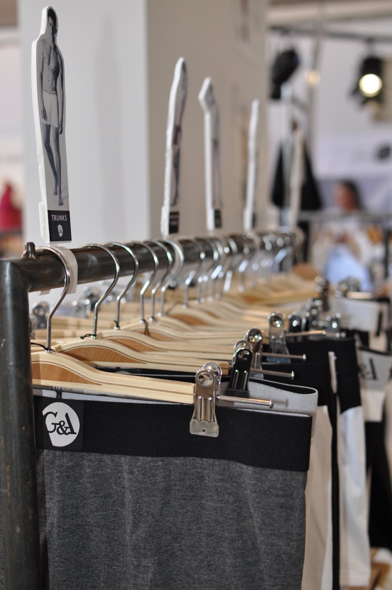 Durch die Kleiderständer von Aluc erspähte ich dann bereits Andreas. Er war mit G&A – Organic Underwear zum ersten Mal auf der Ethical vertreten und holte sich das erste Feedback innerhalb der Branche für seine neue Unterwäschekollektion für Männer ab. Nach meinen sehr positiven Erfahrungen mit VATTER war ich besonders gespannt, was mir Andreas so alles zeigen wird. Für den Start (Auslieferung ab Herbst 2015) plant er mit vier Modellen in insgesamt 14 Stilen und drei Farben. Die verwendete Baumwolle ist GOTS-zertifiziert und stammt aus Indien. Die gesamte Wertschöpfungskette hat Andreas durch seine langjährige Erfahrung in der Textilindustrie im Auge. Besonders auffällig ist übrigens der breitere Bund (4 statt 3 Zentimetern), den Andreas seinen Buxen verpasst hat. Ob das nun „Calvin Klein in grün“ ist (O-Ton eines Messebesuchers), ist mir relativ egal – Andreas hat mich mit seiner Kollektion und seiner akribischen Herangehensweise mehr als überzeugt und ich freue mich bereits sehr auf den Herbst diesen Jahres und eine tolle weiße Boxer Brief von G&A – Organic Underwear.