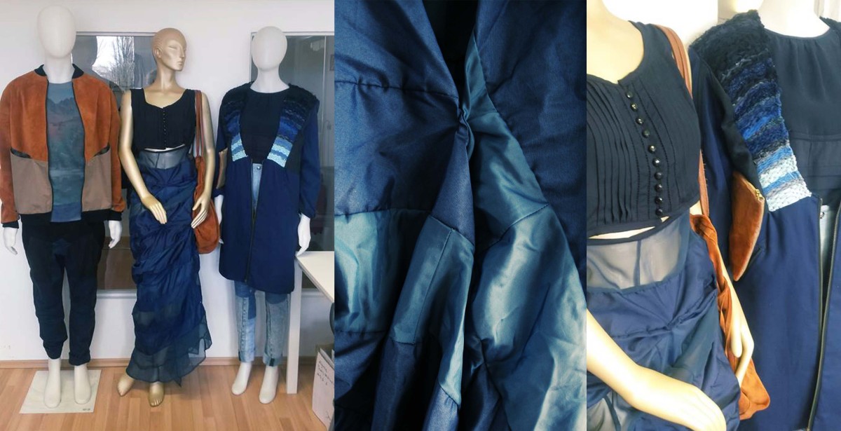 „Uns alle nervt der Massenkonsum in der Modeindustrie, die schlechten Bedingungen der Arbeitsplätze für die Näherinnen und auch die Hungerlöhne die lediglich ausbezahlt werden“, schreibt mir Julia vor wenigen Tagen auf meine Frage zurück, wie sie dazu kam, sich mit einem alternativen Ansatz mit der Modeindustrie auseinanderzusetzen. Denn: WELTANSICHTEN ist eine reine Upcycling-Kollektion. „Das Buch ‚Die Erde von oben‚ inspirierte uns zu dem Thema WELTANSICHTEN. Jeder bekam ein Unterthema: Kati – Felder und Wälder, Lena – Städte und Gebirge und ich – Wasser und Strand. Es wurde viel gepatscht und mit vielen Schnittteilen gearbeitet. Formen wurden aufgeteilt: Lena bekam das Dreieck, Kati das Quadrat und ich alles was rund ist.“ Die Materialien bekamen die drei Jungdesignerinnen ausschließlich geschenkt. Zum einen aus dem Lager des Upcycling Fashion Stores, zum anderen von einem Frauen-Kleidermarkt, der zweimal im Jahr zusammen mit Femnet organisiert wird. Aber auch Mütter von Freunden sind tatkräftige Spender. Wichtig ist Julia, Katharina und Lena, dass nicht nur das Design stimmig ist, sondern auch die Herkunft der Materialien bekannt ist und ihre Arbeitsgrundlage bereits eine Geschichte hat. „Manchmal findet auch ein Stoffmitbringsel aus irgendeinem Land den Weg in unsere Kollektion. Dabei verwerten wir nahezu alles: Hosen, Jacken, Mäntel, Röcke, Schürzen, Gardinen, Tücher, … alles was gerade passt“, erzählt Julia begeistert von der Entstehungsgeschichte von WELTANSICHTEN.
